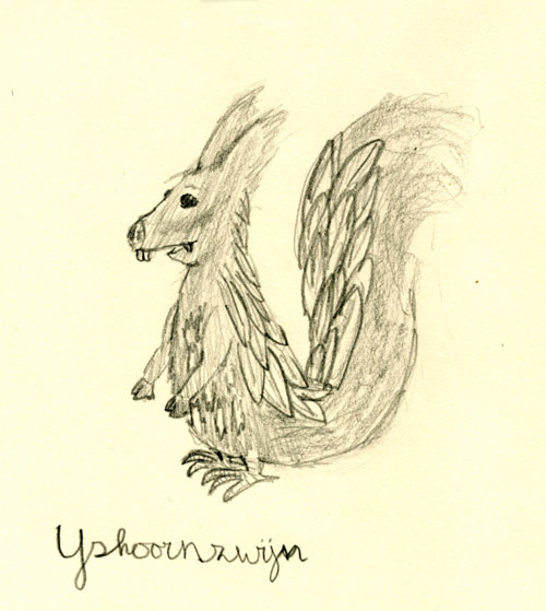 Bijvoorbeeld: met de kop van een mestkever, het lijf van een eekhoorn en de staart van een hagedis. Geef het wezen ook een naam zoals bijv. Mesthoornedis