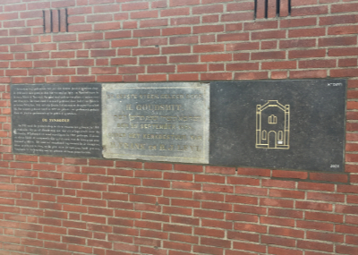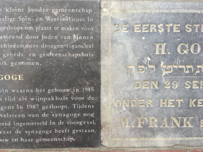 In het jaar 1858 werd de oude, eerste steen (op de foto in het midden) aangebracht rechtsonder in de gevel ter ere van de bouw van de synagoge voor de Joodse Gemeenschap in Schiedam. In dezelfde gevel, op dezelfde plek, is de steen vermoedelijk lange tijd omgekeerd (blind) ingemetseld geweest, het pand was toen sinds 1915 in gebruik genomen als wijnpakhuis. Degene die de gevelsteen ontdekte en redde tijdens de sloop in 1987 van het pand heeft zich daar toen over ontfermd en op de stoep voor zijn voordeur gelegd. Tot eind juli van dit jaar heeft de steen daar gelegen.