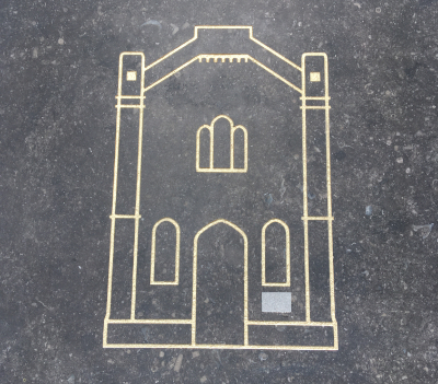 Deze gezandstraalde contouren laten tevens de plek zien waar de oude gevelsteen zich bevond, rechtsonder in de gevel van de synagoge.