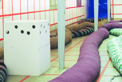 Audiotour vanuit witte kast met gaten. (werk op de vloer van Aernout Mik | Berend Strik) Museum voor Moderne Kunsten, Arnhem